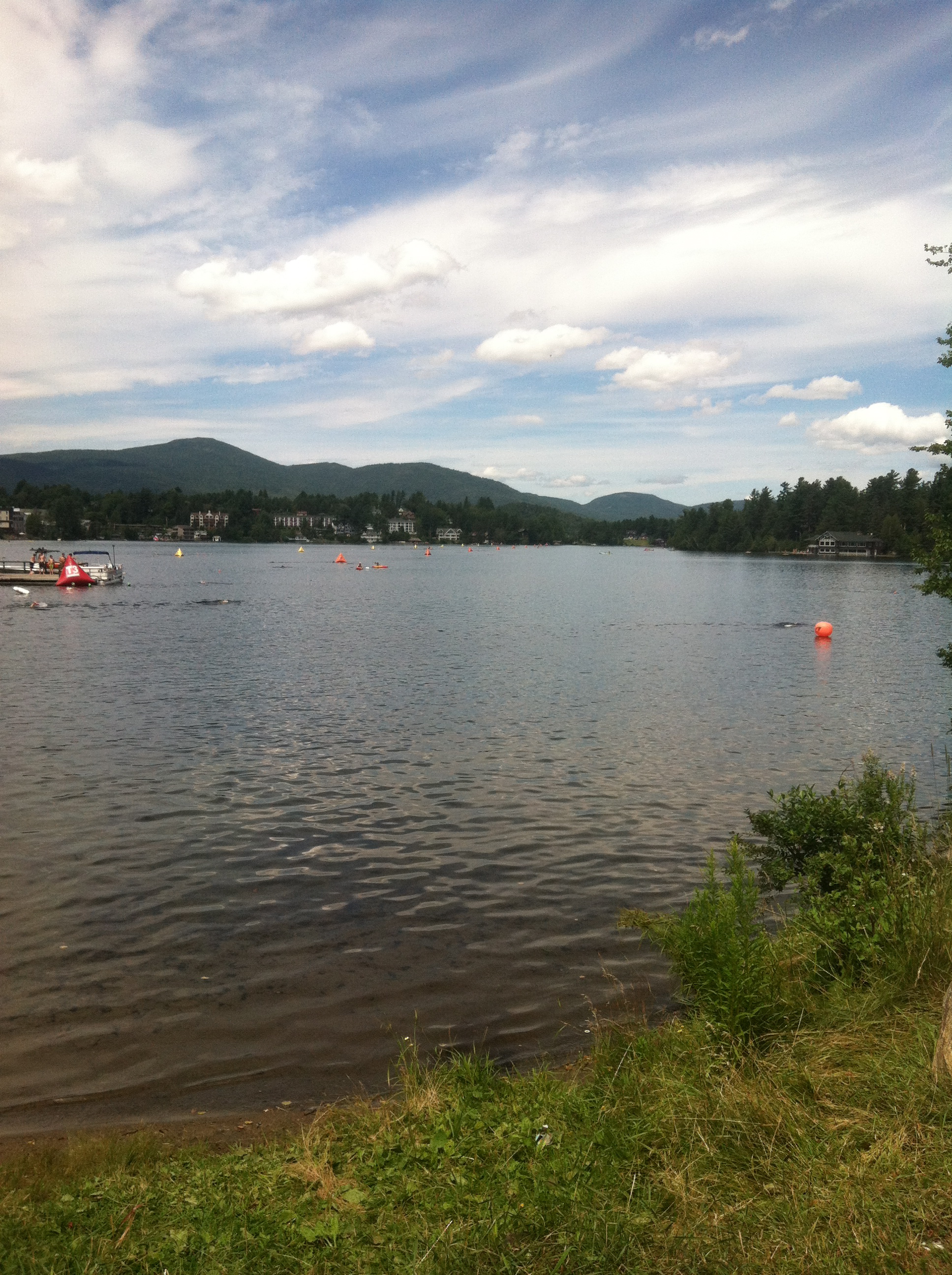 Contrary to what you might think the swim portion of Ironman Lake Placid does not actually occur in Lake Placid but rather Mirror Lake which is the lake that is featured in the waterfront of the town. Lake Placid itself is out on the edge of town. Again, the full IMLP course is 2 loops totaling 2.4 miles. Coach Erica & I would swim one loop. Only 1.2 miles. ‘Cause that’s not crazy.