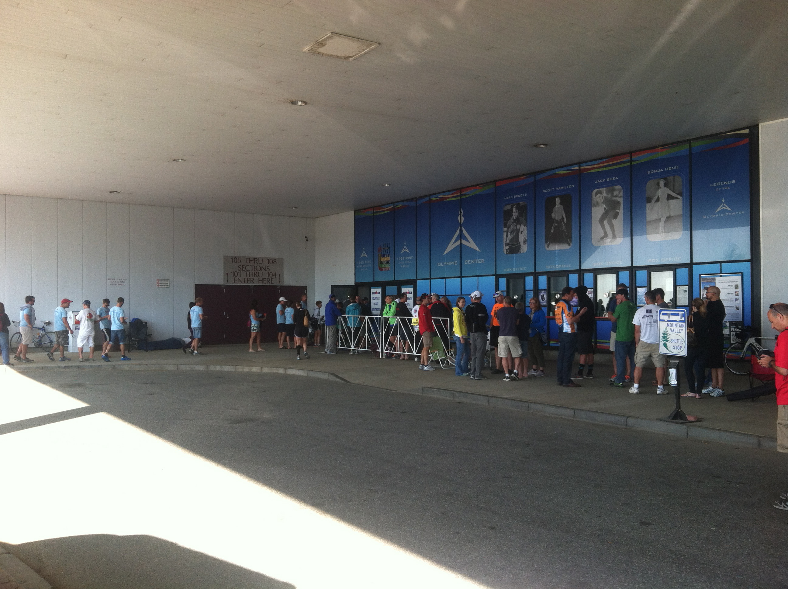 I arrived back in Lake Placid at 3:45 a.m. on Sunday morning. It was considerably easier to park. I half-expected to see a line of potential crazy people waiting on the sidewalk outside the conference center where registration would occur. But IMLP is pretty accommodating. I was able to park in an available visitor spot right in front of an open door with a night watchman and a sign that said “Ironman Registration”. All I had to do was show my volunteer t-shirt and I was admitted. I was the first person in line who hadn’t slept there. There were about 15-20 folks who worked the finish line and than slept on the floor of the Olympic Center hallway.