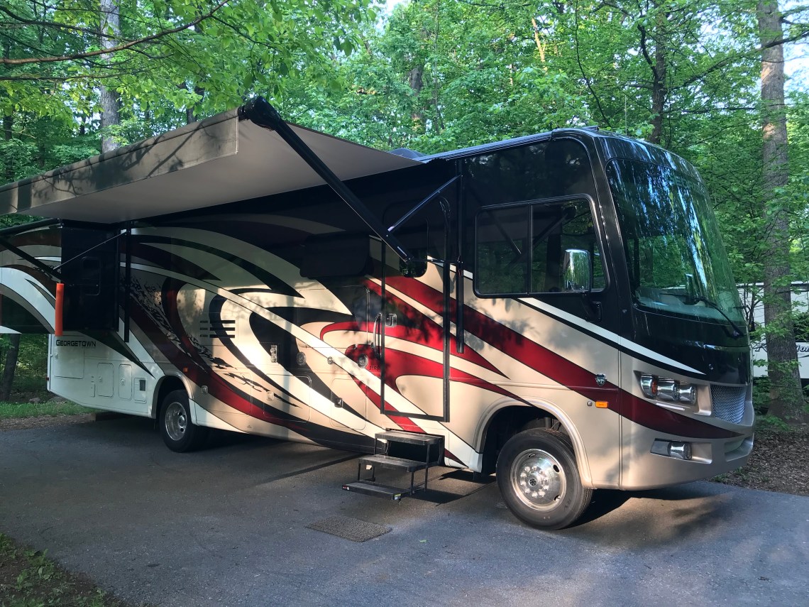 Otherwise we’ve been doing some camping and learning the new rig. I have been having a ball driving “The Beast”. The Ford F-53 chassis is significantly different to drive then the Mercedes Sprinter chassis of our old, little coach. The F-53 is a true truck chassis with a powerful V10 and 6 speed transmission. It was a little disconcerting the first time that puppy downshifted on a hilly descent and started roaring at me but now that I know how to use it I love the roar and how it controls the speed without me riding the brakes. I also love the stability on the road and not getting pushed around by every bread truck or car carrier that goes by. As I type this we are at our first Forest River F.R.O.G rally. (Forest River Owner’s Group). Despite a prevalence of opinions from the internet-at-large I have found the build of our coach to be very high quality and Forest River to be much more supportive and communicative with owners than Winnebago ever was. So far so good!