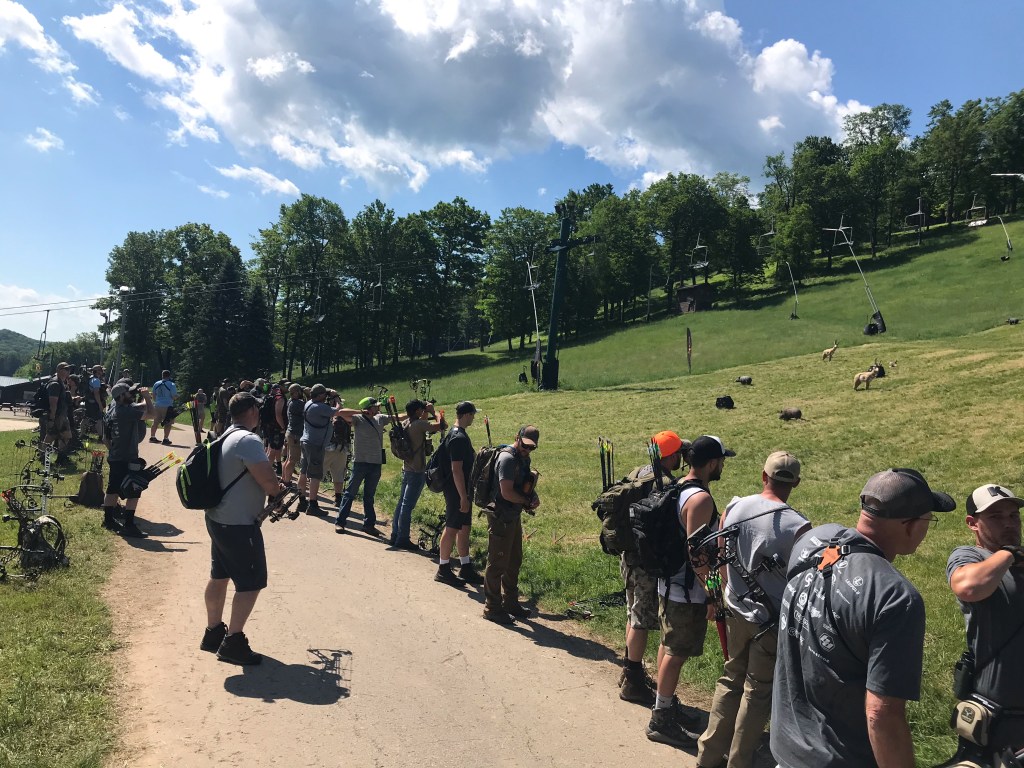 For my own preparation, I had attended a couple local 3D shoots where I had hoped to use the practice ranges to sight in my longer sight pins. Since I have only been bowhunting white-tailed deer for the last few years, I haven’t bothered to sight in or practice longer than 30 yards. I’m very proficient at those distances and, having been lucky enough to have killed a couple hundred deer in my life, don’t need to be taking shots any farther than that. I’ve also reduced my stable of bows to one and it is more or less setup as a close range hunting bow. To get ready for TAC, I needed to work on those longer distances. Unfortunately, there was little opportunity to shoot at longer distances at either of the clubs I went to. But, no worries. Total Archery Challenge offers a full practice range with targets out to 115 yards. If you aren’t an archer, you can’t imagine how ludicrous it would be to try to hit a target at 115 yards with a 60 yard sight pin. Picture trying to water a plant 200 feet away with a 25 foot hose. Needless to say I had no plans to shoot at any targets that far and chose to concentrate on trying to set my 50 and 60 yard pin before we hopped on the ski lift for our nock time. It is not surprising that we were not the only ones on the practice range and the time between shooting, arrow retrieval, and setting pins was lengthy. I got a little impatient and, when I felt I had my pins close enough, I called it good. In hindsight I probably should have spent a bit more time on the practice range.