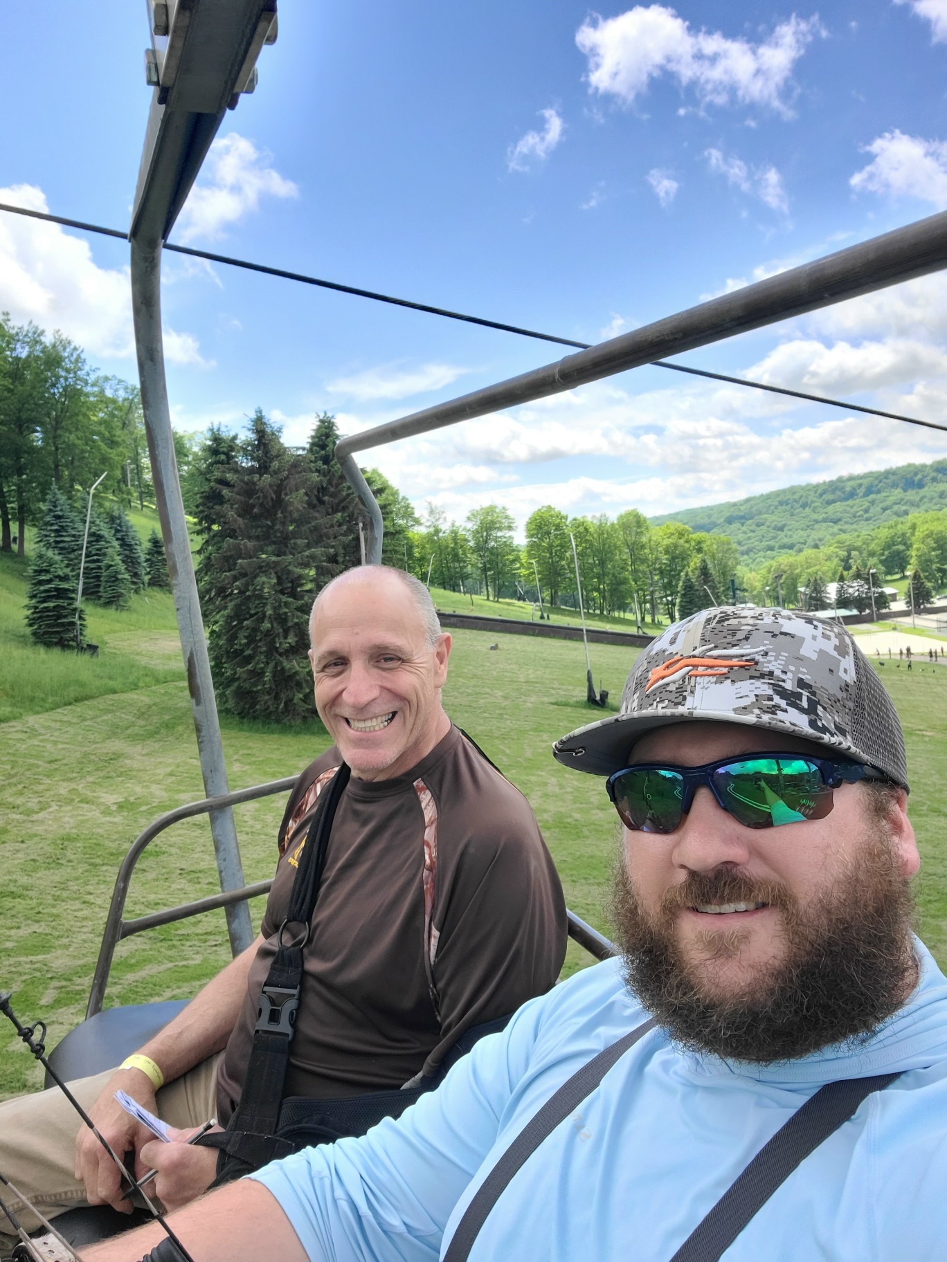This was my first time on a ski lift and I hoped I wouldn’t drop my bow, arrows, pack, or me. Andy confidently snapped a selfie of he and Jim (who went along as score keeper) on the ride up. I didn’t have the nerve. I’m certain I’d have dropped my phone. As it was, I enjoyed the views including the birdseye view of an incredible number of baby ground hogs. They seemed to be everywhere.