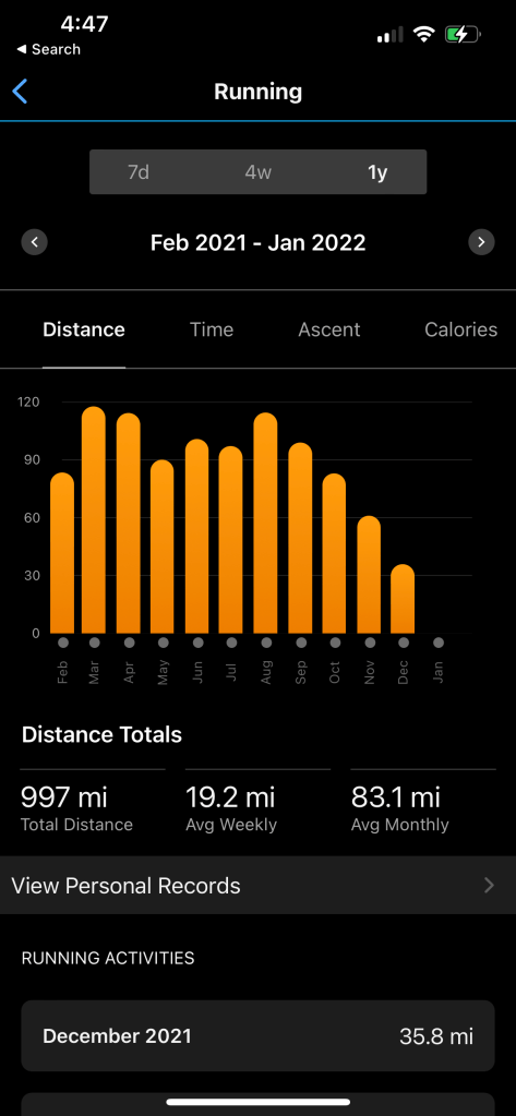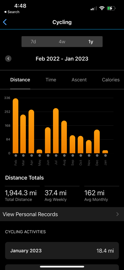 Really when I stop to think about it, my early-2022 PT appointments seem like a long time ago. I remember through the end of 2021 and my relatively inactive beginning of 2022 noticing an ever more burgeoning belly and the numbers on the scale creeping upwards but kept thinking “As soon as I’m through this and can run again, I’ll be more motivated to eat better, run more, and be healthier.” Well, it’s 2023 now and I’ve been running freely since April and let’s just say that wasn’t it. In fact, when reviewing my yearly tally for running, biking, and swimming, 2022 was my lowest mileage year in a long time especially for running. Running-wise I only logged 500-and-something relatively slow miles. I didn’t run for almost all of January and February due to foot and ankle rehab and then kept things pretty minimal as I ramped back up. This slow, shallow ramp was partially due to a legitimate concern about blowing out my decrepit post tibial tendon but also due to a total lack of making any effort to push myself.