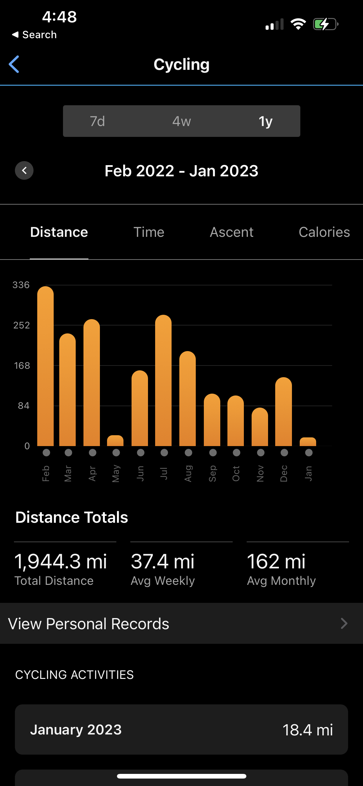 I was pleasantly surprised to see my swimming distances actually increased in 2022 which, at first glance, was a little surprising since I did no open water swims. Open water swimming had become a much look forward to semi-monthly event over the course of my triathlon life. But my desire for triathlon left in 2019. My open water swimming venue is much closer to work than home and I didn’t feel the need to either commute to the lake or pay more money for something I could do at home in my local pool. Some of the additional mileage can be attributed to a very wet January and February when I was unable to run. I have noticed my average times for 100 yards has crept inevitably higher but, at this point, I’m not that worried about it. As Dori would say, “Just keep swimming!”