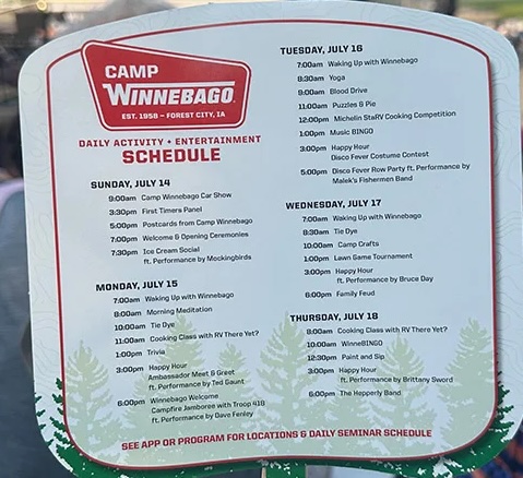 Upon our return from the bus tour, I reviewed the agenda for the week. I had no expectations of the rally being anything I would enjoy and intended to spend most of the time hanging out with the View/Navion crowd but the agenda showed promise. There were vendors one could shop and schedule service with, lots of informative discussions from experts on both RVing in general and our rigs and equipment. There were also fun activities listed and some pretty good music and entertainment planned for the evenings. Winnebago also had all the new models available to check out. There were several meals provided by both Winnebago and the local RV dealer who had close ties to our View/Navion group.