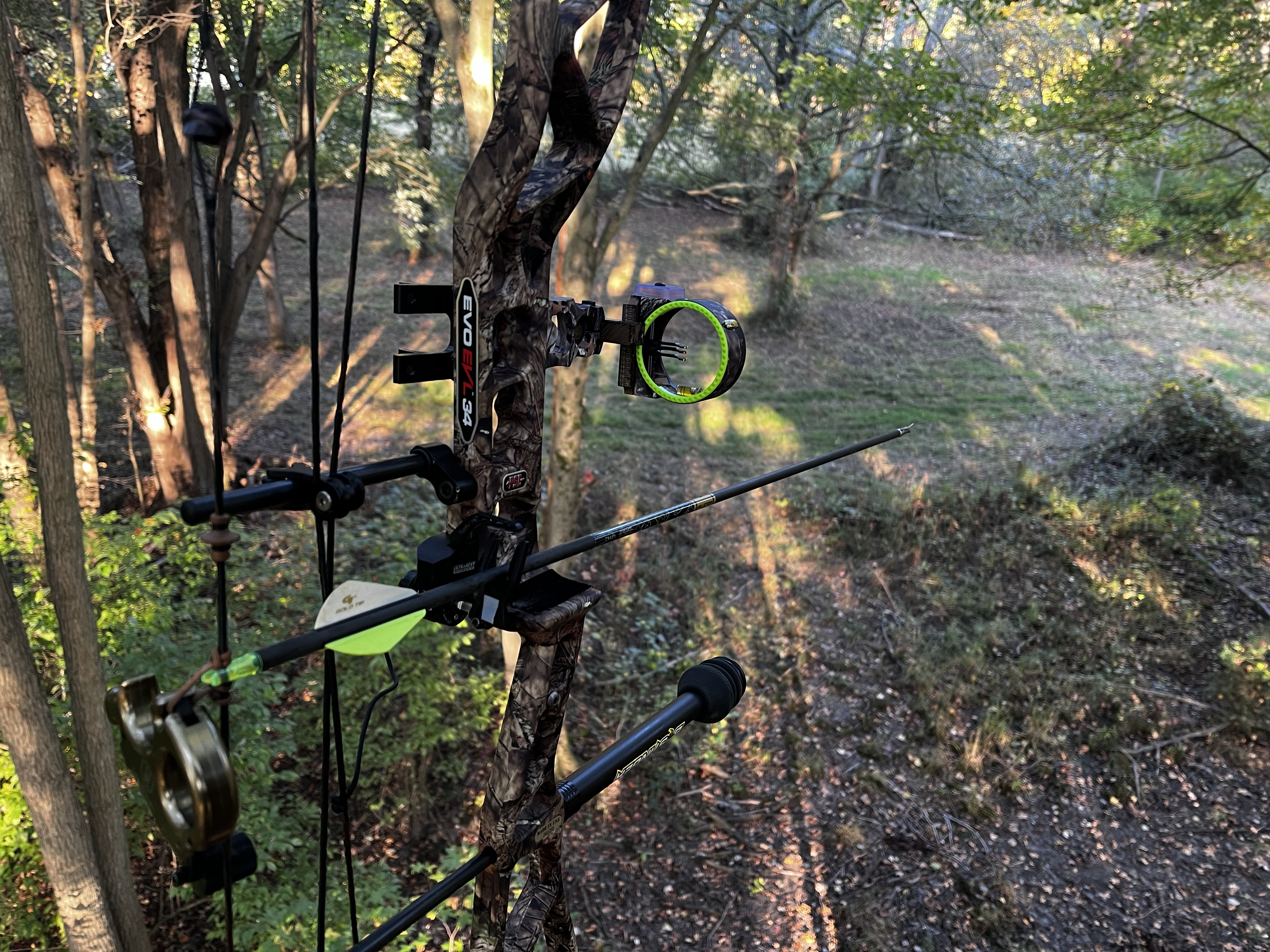 Movement nearby caught my eye. A deer emerged from the brush on the hillside a mere 20 yards away. I saw antlers and recognized a legal buck. He was right behind my tree, an area that is nearly impossible to shoot. Keeping an eye on the buck, I flipped my glasses off and grabbed my bow from its hook. The buck moved a few yards up the hill and was slightly angled behind the tree. He searched up the hill for a deer that wasn’t there. It was clear his plan was to head straight up and away. If I were to get a shot it was now or never. Unfortunately, I had installed my bow hanger a little low. This would make it difficult to draw and shoot without hitting the metal hanger. The buck turned and scratched his back leg with his antlers completely obscuring his head. Now was the time!