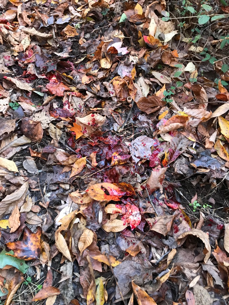 I remember another blood trail a few years before. Joe and I had waited for a couple hours after the shot because I wasn’t 100% certain of the of the hit. The buck had disappeared from view some 60 or 70 yards below me in heavy cover. Once enough time had passed, we assumed the trail. We found my arrow and the first blood sign that looked quite good. I looked up, and there lay my prize a few feet from where I last saw him. The shot was obviously way better than the doubts in my mind led me to believe.