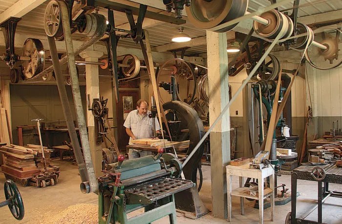 This is proven out at Greenfield Village where an actual machine shop is setup. Some of the tools are regularly run for demonstrations. Sadly, the belts that run the machines are turned by electricity instead of steam. The usage of the tools is the same. We watched as a craftsman ran a lathe and press to produce a brass candle holder.