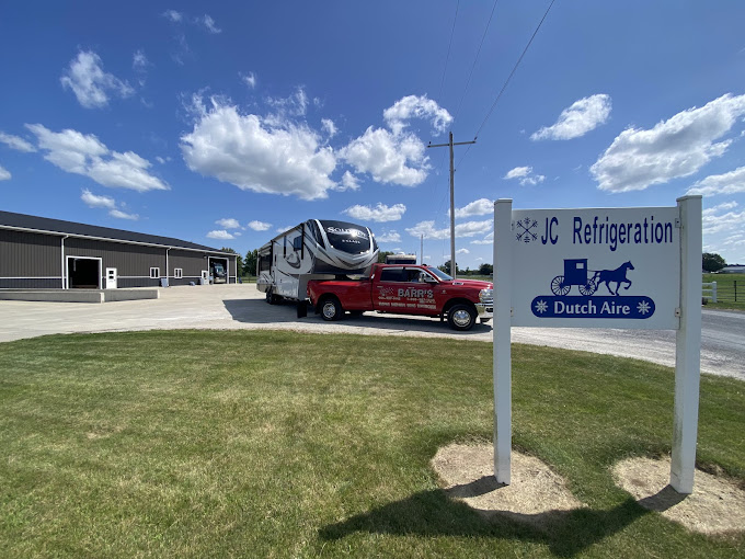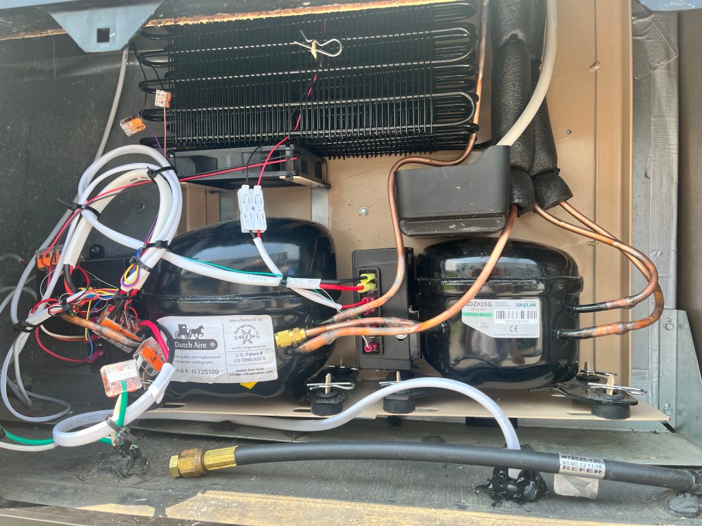A light rain tapped the aluminum canopy roof over my head as I emptied the last bag of ice I hoped to buy into my cooler where we were keeping our perishables. We had just parked our motorhome in the parking lot of Adventure RV in Shipshewana Indiana. We were there for a major repair to our RV refrigerator. One of the reasons we chose our model of motorhome was because it came with a 2 way propane/electric refrigerator. This allows use while unplugged from A/C power. Unfortunately, unlike the smaller refrigerator in our old motorhome which was capable of turning a live kangaroo into block of ice, this big 18 cubic foot cold box was almost anything but cold. It hadn’t really worked well since day one. We always wound up with sour milk and brown lettuce. So here we were getting the guts of the unit removed and replaced with a dual-compressor 12 volt system built in Shipshewana by JC Refrigeration.