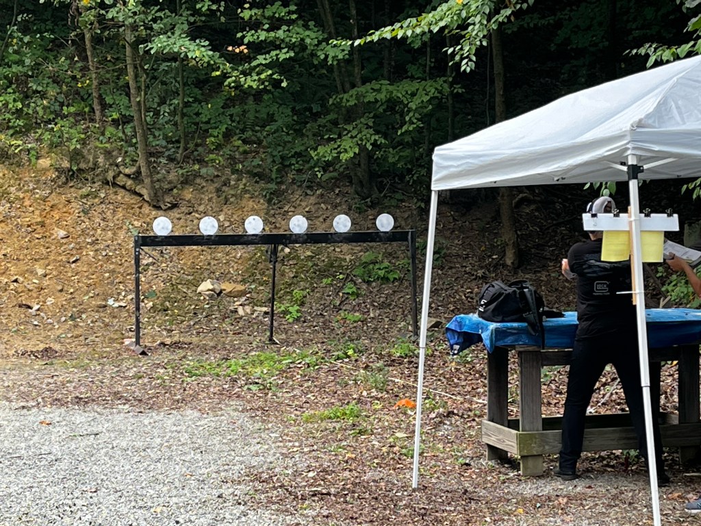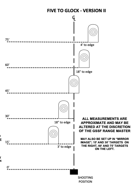 As a quick explanation, Five to Glock is simply 5 GSSF cardboard targets at increasingly longer distances. The shooter shoots each target two times attempting to hit the center. The score is a combination of the total time it took to shoot plus any additional time for less accurate shots or misses.